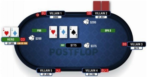 我想首先来看一个反主动下注的例子,因为这是缺省打法。在这手牌中,我在小盲位置拿着99跟注了一个小额翻前加注,3人入池,翻牌是3♦ 2♥ 5♥:(PS6,筹码底池比为9)
