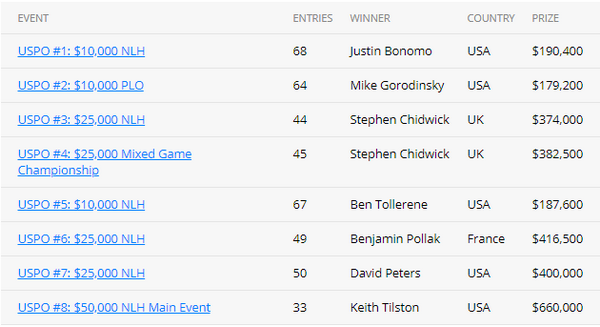 在其短短两年的历史中,美国扑克公开赛已经颁发了超过2100万美元的奖金,并见证了一些扑克界最知名的选手是如何取得胜利。前任美国扑克公开赛冠军Stephen Chidwick和David Peters各自积累了超过3000万美元的现场比赛收入,其他USPO赛事冠军包括Nick Schulman、Bryn Kenney、Ali Imsirovic、Justin Bonomo、Lauren Roberts和Mike Gorodinsky。
