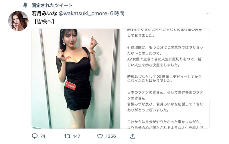 看到声明后我马上发了讯息向经纪人致意,对方说若月みいな(若月美衣奈)是很满足地为自己的生涯画上付止符,和拳王一样没有任何遗憾,但就像她在X上所写的,如果你想知道不再是女演员的她接下来的日常生活那欢迎去追踪她另一个X的帐号,而她原先这个若月みいな(若月美衣奈)的帐号将会在不久后删除ー