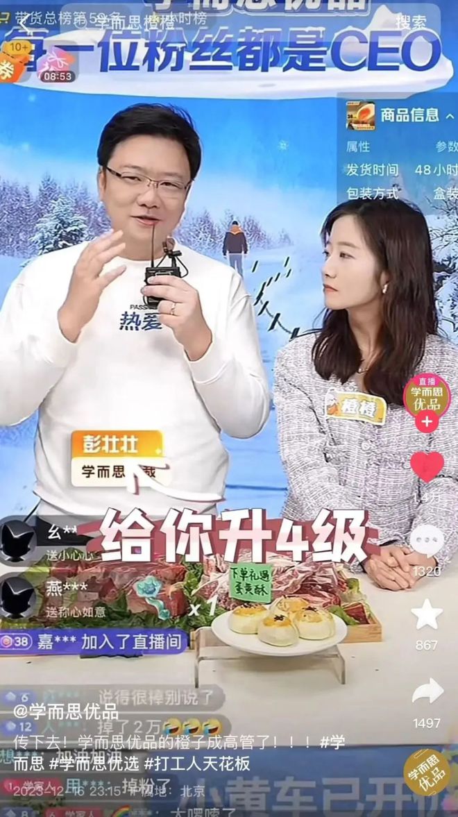 12月16日晚,学而思总裁彭壮壮亮相“学而思优品”直播间,宣布了给主播橙橙升职事宜: