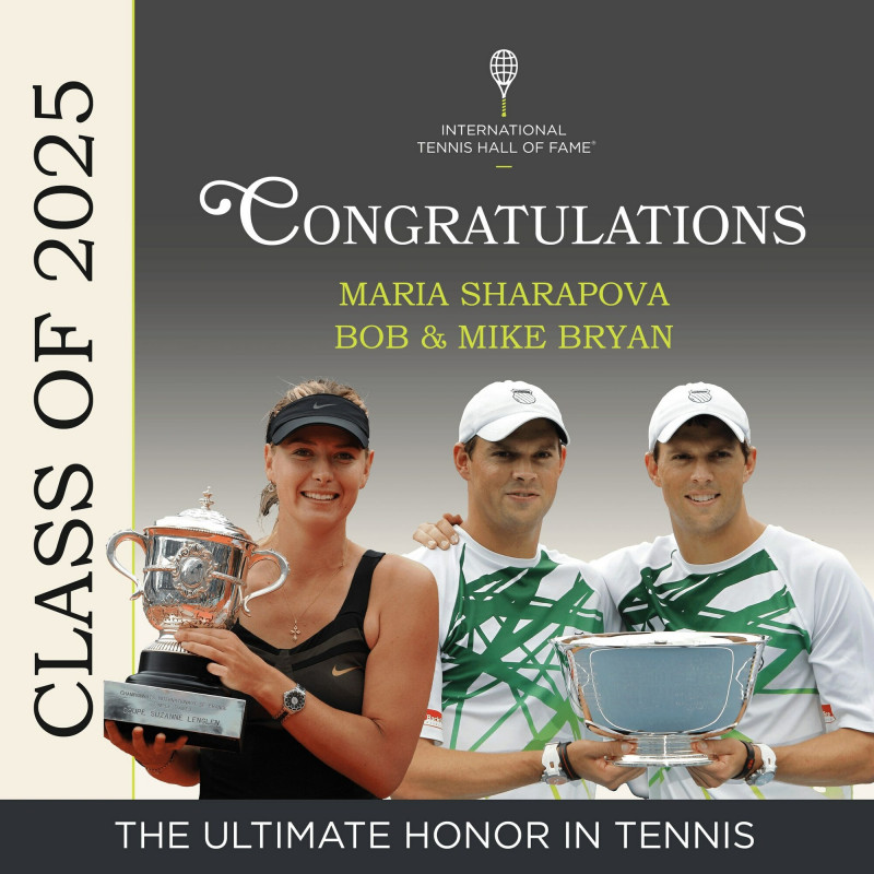 玛利亚·莎拉波娃 (Maria Sharapova) 是五届大满贯单打冠军,以场上的勇气和场下的关注而闻名,而鲍勃和迈克·布莱恩 (Bob and Mike Bryan) 是一对双胞胎,曾一起赢得 16 个男子双打大满贯冠军,创下了纪录,他们是国际网球名人堂的首批候选人。