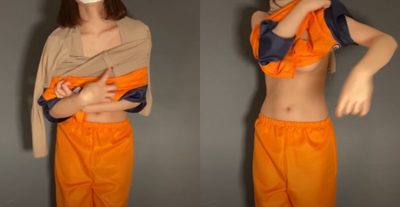 いつかちゃん這次挑戰換上七龍珠孫悟空的衣服,一開始她穿著一件連身的針織洋裝,先整件脫掉,露出了裡面的內衣褲,還因為動作太大露出車頭燈,只能打上馬賽克遮;いつかちゃん套上洋裝後,開始在洋裝下脫下內衣和內褲,隨著動作瀕臨走光邊緣。
