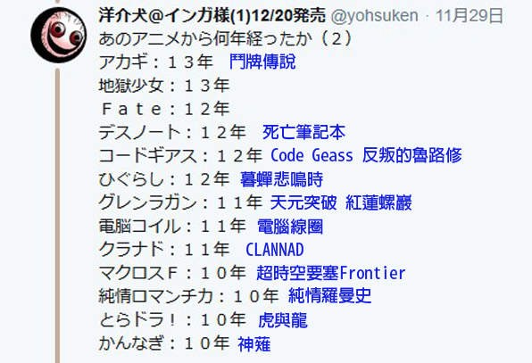 最近有一位推友“洋介犬@インガ様(1)12/20发売@yohsuken”整理了一份“那部动漫距离现在过了多少年”的表单,里面列出了一些不错有名的作品,有兴趣的朋友等等往下一拉就可以看到,至于结果是不是你喜欢的...我就不知道了(我只知道看了之后我感觉又更老了)。