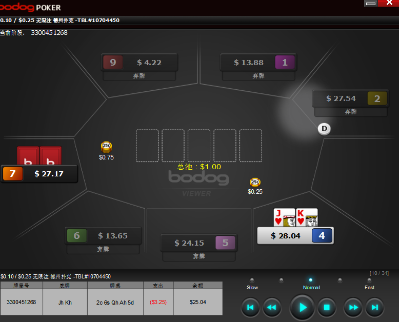 NI25,我在大盲位, 7号玩家是我眼里的松凶玩家,持续下注多,对手开open0.75,我call,这是我喜欢的加注起手牌, 面对这样的玩家,我不想玩大池, 翻牌圈,对手下注0.75, 我思考一会,对手30%是空气,最大是一手成对牌, 我选择call, turn A,我想了想,还是没有成牌,保持小底池最好,check, 没想到对手也check ,我当时肠子悔青,河牌 5,我想了,只有诈唬,否则,输定了, 但是怕他再反加大注, 下注约四分之三pot,对手秒call. 我当时觉得这手牌玩的太臭, 推出下线了……