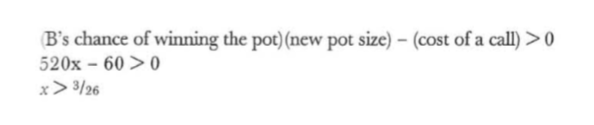 关于这条定律有一些特例,我们会在之后的一些更复杂的听牌对抗成牌的游戏中看到它们。现在让我们考虑B的策略。我们已经发现只要B跟注的EV大于0时他就会选择跟注。我们可以通过解一个不等式来找到所有的B会跟着的情况,另x表示B赢下底池的概率:
