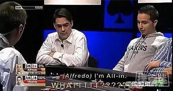 Senor中了明三条(当然,大家都不知道他的牌),Vicente中的是顶对顶跟张,边看牌变为自己翻牌前出的糗摇头。