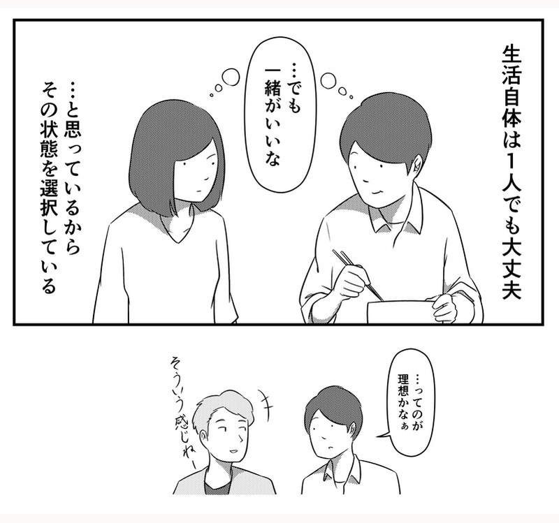 两个能够独立生活的个体,在一起生活不是因为对某一方的依存,而是为了想共同生活。如此一来即使其中一半倒下,另一半的生活也能不受影响反而还能扶持对方。这样的论调大家是否也能够认同呢?