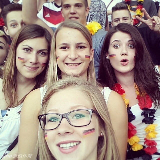 巴西世界杯半决赛,东道主巴西对阵德国上半场结束后,德国队便已5-0大比分领先巴西队,此时德国本土的球迷们忍不住自拍狂欢庆祝国家队的神勇表现,这其中不乏大量美女球迷,真是萌萌哒!