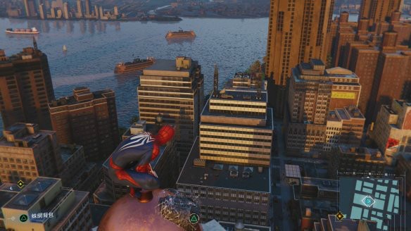 游戏中的摆荡操作非常容易上手,玩家通过简单的按键配合就能做出极具力道感和表演效果的姿势和动作。在建筑表面还有不少定位点,玩家通过L2键+R2键就可以发出蛛丝迅速靠近,在到达定位点后迅速按×键能进一步提升速度,让摆荡的过程更加迅速、流畅。本作的摆荡过程无论表现力还是手感在迄今为止的蜘蛛侠游戏中都可以说是最棒的。