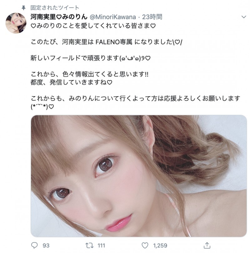 Faleno宣布吸收了单体小姐姐河南实里,这位之前到台湾活动的小姐成为了专属。这新闻确实让人有点惊讶,翻查了河南实里的社交账号,发现她在前一天就宣布有重大事件要说了。下面的评论有不少粉丝以为她要宣布引退,还担心了一晚。不过还好,不是不干而是更上一层楼了。河南实里不仅成为了Faleno专属小姐姐,同时她还是Faleno在自由市场中拿下的第一位企划小姐姐(七海ティナ不是不算,她虽然来看了SOD STAR,但完全没去过别的片商出作品)