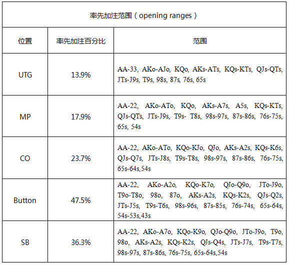 下面的底牌表格是我的一位叫做Nick Howard的牌友创建的。这些范围假定在所有位置(除了按钮位置,这个位置的加注为2.5BB)的率先加注都是3.5BB。尽管这些范围远远称不上完美,但它们是牌手可用来对抗强手的合理范围(如果他们不想自己花时间创建的话)。