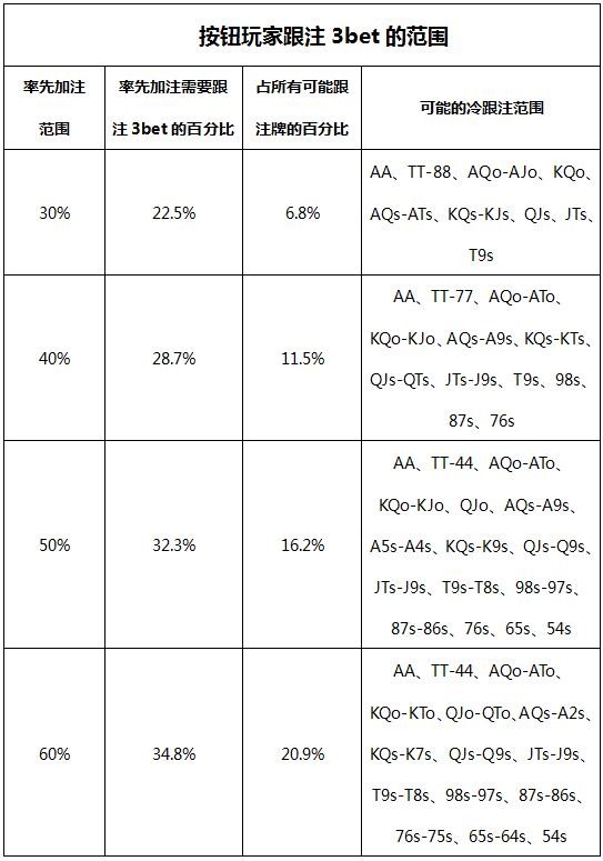 下面的表格给出一个按钮位置加注者面对大盲位置3bet时可能的跟注范围。它假定大盲玩家最差的3bet牌被跟注将损失4.5BB。