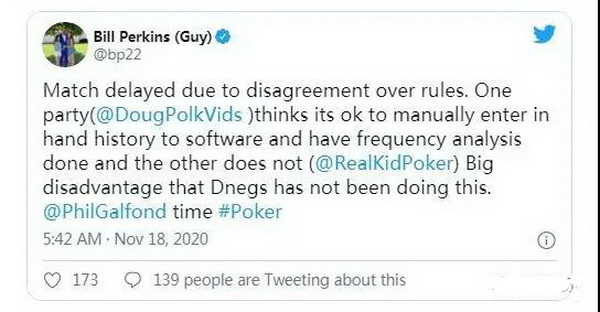 "现在Perkins在推特上说'一方认为可以手动将手牌历史输入软件并进行频率分析'? 我没有向任何软件输入任何手牌历史。我打开客户,看他的按钮有多少次弃牌。我们也有一个法官来仲裁这件事,现在Perkins就用超级失误指责这场比赛中发生的事情来炒作。完全不符合常理,我不相信我要为打开客户端,并在400次手牌练习中看到我对手按下按钮的次数。这是我遇到过的最挑剔的贱人。"