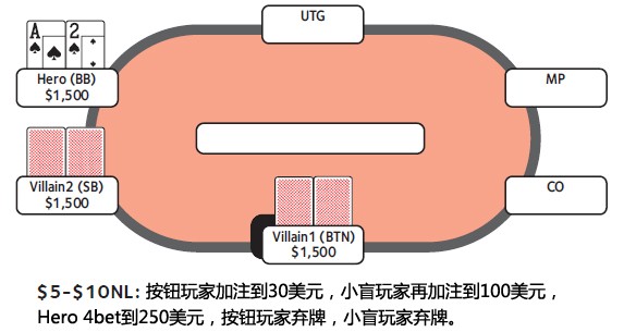 Hero在这种场合是为了赢得140美元而拿240美元去冒险。如果64%的时候两个对手都弃牌,Hero可以用任意两张牌做有利可图的4bet。因为冷4bet是一种未充分利用的招数,这往往是常有的事。当你意识到Hero即使被跟注仍然有可观的胜率时,情况会变得更好。再加上底牌阻断效应,Hero可以通过4bet快速赚取大钱。