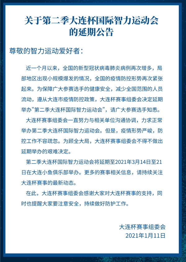 近一个月以来,全国的新型冠状病毒肺炎病例再次增多,局部地区出现小规模爆发的情况,全国的疫情防控形势再次紧张起来。为保障广大参赛选手的健康安全,减少全国范围的人员流动,遵从大连市疫情防控政策,大连杯赛事组委会决定延期举办"第二季大连杯国际智力运动会",请广大参赛选手知悉。