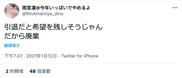 这位胸部很大的女优没多说什么,就只是强调自己「不做了」:她不会换个名字在其他经纪公司再出发,也不会去风俗店上班,想见她就去参加摄影会或去SOD Land—在没抓到她复活或是在风俗店上班的证据前我都当她讲真的,因为从留言来看雨宫凛离职的意愿相当强烈,强烈到她说自己这样应该不算引退、比较像是「廃业」、意思就是放弃这份工作了⋯
