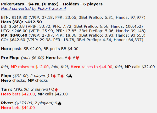 我认为对手是个常客玩家(reg)。欢迎评论我在每条街的打法。我认为我的转牌圈下注应该大一点。你们怎么看待我的下注尺度?