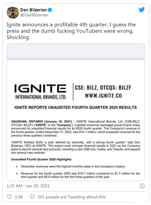 该公司主要专注于CBD产品,在2020年取得了积极的收尾。第四季度的收入超过了1010万美元,Bilzerian非常乐意与他的推特粉丝分享这一事实。