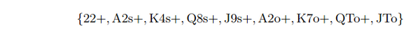 假设对手游戏策略是正确的,而我们在小盲将底牌展示给对手,那么在什么样的筹码深度下全压依旧是比弃牌要好?Chubukov numbers给出了这种情况的答案。举个例子,假如我们手持AA,那么无论多少筹码无论对手是什么牌我们全压都会比弃牌好。而如果我们手持KQs并且全压,那么在大多数情况下(全压/弃牌游戏中)对手会用任意对子,任意Ax以及KQ来跟注。对手不会经常持有这些牌,即使他们有,我们也会赢下一部分。这种策略在筹码低于43BB的情况下,全压相对于弃牌来说都是+EV的。而54s仅仅能在2.4BB以下筹码这样游戏,这和我们平衡的全压/弃牌策略中的23BB是矛盾的,因为这里对手知道我们拿到了54s,他就能很轻松的用72o这种垃圾牌进行跟注。所以,Chubukov numbers很难与实际游戏联系上,因为在实际游戏中,对手的决策是基于我们的整个范围而不是确切的一手牌。