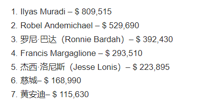 总体来说,这是一个缓慢的一天,第一个淘汰赛要等到比赛开始约三个小时之后。穆拉迪大部分时间都保持稳定,但他的转折点是对阵罗尼·巴达(Ronnie Bardah),剩下四名球员。巴尔达的收入提高到55万,穆拉迪(Muradi)的两个黑色王牌将其三下注提高到130万。Bardah跟注,翻牌圈有两家具乐部以5-3-2落败,给Bardah抽签。巴达加注,穆拉迪下注155,000,巴达加注到915万,穆拉迪全押,而穆拉迪发出了跟注。转牌中的4给了穆拉迪一个直路,但实际上并没有改变情况,因为巴达仍然需要他的同花顺才能存活。它并没有出现在河牌上,就好像Muradi凭借2152.5万筹码成为了筹码领先者。